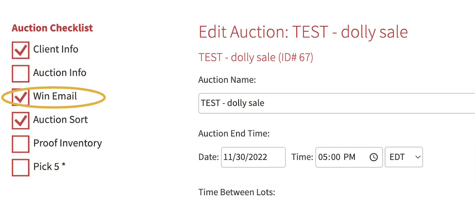 - Under the auction checklist to the left of the seller’s screen, select “win email.”
